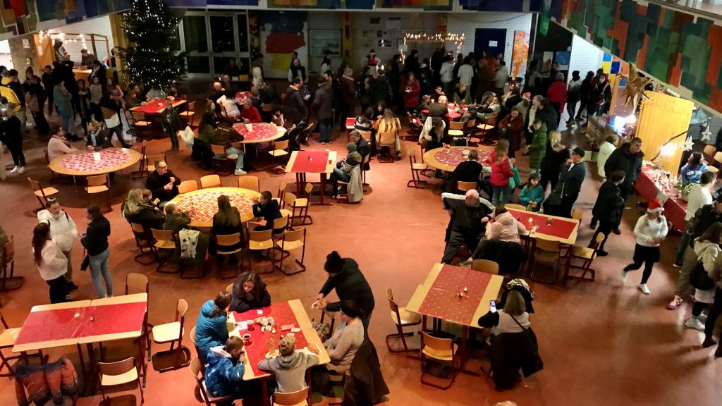 Ein viel beklatschtes Highlight war die aus unterschiedlichen Beiträgen unserer Schüler*innen bestehende Aufführung auf der Bühne im kleinen Atrium. Hier gaben unter der Leitung verschiedener Lehrkräfte und der professionellen Moderation von Mia Lother (10b) und Birk Wittmann (10a) die Bandklassen 5a und 6a sowie die Schulband ihre musikalischen Künste zum Besten, die Klasse 5c trug einen englischen Christmas-Sketch bei, die ukrainische Brückenklasse überraschte mit einem Song aus der ukrainischen Heimat. Die Technikgruppe unter Leitung von Herrn Richter sorgte für den richtigen Sound und die passende Beleuchtung. Frau Habermann hatte sich um die weihnachtliche Dekoration der Bühne gekümmert. Alle Beteiligten bescherten dem Publikum ein ausgeglichenes Programm und einen gelungenen Abend.