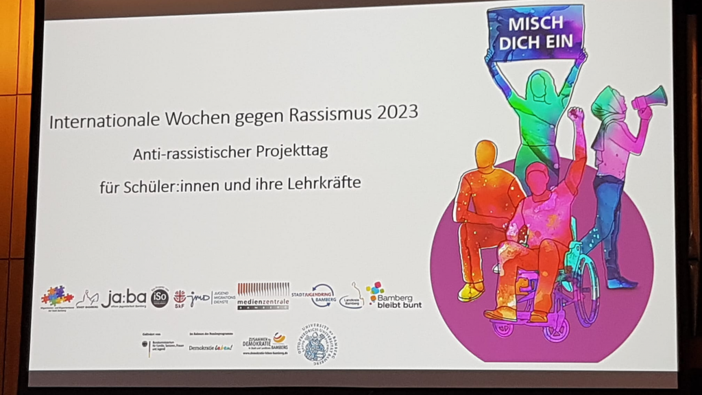 Am 29.03.2023 hieß es wieder „Misch dich ein!“. Innerhalb der internationalen Wochen gegen Rassismus konnten die Schüler und Schülerinnen der Klassen 8a, 8c und 6a den Projekttag für Schulen, der diesmal in Räumlichkeiten der Universität Bamberg stattfand, besuchen. In unterschiedlichen Workshops wurden die Lernenden unter anderem für rassistische Sprache sensibilisiert, konnten Lebensgeschichten von Geflüchteten lauschen, sich gemeinsam mit Menschen von unterschiedlicher Herkunft oder mit körperlichen Beeinträchtigungen im Improvisationstheater erproben, Erfahrungen von jüdischen Glaubensangehörigen und queeren Personen mit Diskriminierung sammeln. Auch die Lehrkräfte Miekisch, Schmitt, Hans und Habermann durften sich im Lehrerworkshop mit Lehrenden anderer Schulen über ihre Eindrücke von Diskriminierung an den jeweiligen Schulen austauschen. Ein Tag voller Einblicke in eine bunte Welt unterschiedlichster Persönlichkeiten und die Erkenntnis, dass man andere Blickwinkel einnehmen muss, um vermeintlich Fremdes zu verstehen. „Misch dich ein!“ lautete die Message an die Jugendlichen, welche sich bewusst gegen Rassismus und Diskriminierung einsetzen sollen.