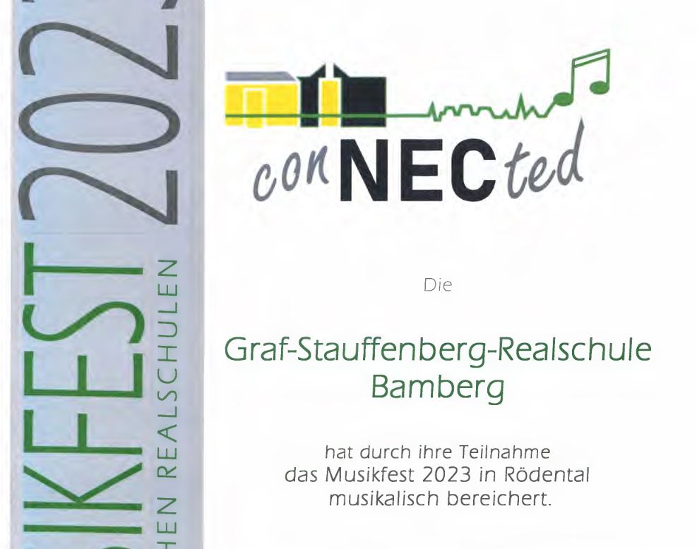 Musik verbindet – unter diesem Motto fand am 04.05.2023 das Musikfest der oberfränkischen Realschulen in der Franz-Goebel Halle in Rödental bei Coburg statt. Die Schülerinnen und Schüler waren im gemeinsamen Singen von einzelnen Songs miteinander verbunden im Einklang mit der Musik. Das gemeinsame Singen und Musizieren hat einen unschätzbaren pädagogischen Wert und bietet ein gemeinschaftliches Erlebnis. Musik ist ein verbindendes Erlebnis, das als Erinnerung auch lange nach der Schulzeit bestehen bleibt. Musik verbindet, auch wenn sie schon längst verklungen ist. Einzelne Schulen präsentierten Gesangs- und Instrumentalstücke aus verschiedenen Musikgenres auf der Bühne. Die teilnehmenden Jugendlichen der Graf-Stauffenberg Realschule beteiligten sich engagiert im Singen der gemeinsamen Gesangsstücke und erlangten einen Einblick in die musikalischen Gruppierungen von anderen oberfränkischen Realschulen. Mit dem Überreichen einer Urkunde für jede teilnehmende Schule ging ein stimmungsvoller und inspirierender Abend mit dem gemeinsam gesungenen „Abendlied“ von Christoph Hiller zu Ende.