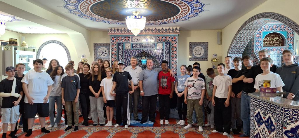 „Salam aleikum“ – Frieden sei mit Dir. Ein Friedensgruß, mit dem die siebten Klassen in der Bamberger Moschee begrüßt wurden. Sie machten sich am 8.7.2024 auf den Weg, um die muslimische Gebetsstätte zu besichtigen. Mehmet Cetindere brachte den Schüler/innen die Bestandteile, Verhaltensweisen und Gebetsrituale in einer Moschee näher. In Socken durften die Jugendlichen den Gebetssaal betreten und das reich verzierte Gebäude betrachten. Die Abfolge eines Gebetes, die Gebetshaltungen und deren Hintergründe wurden praktisch dargestellt. Berührungsängste zur Religion des Islam konnten abgebaut werden und der Respekt untereinander gestärkt werden, indem Gemeinsamkeiten und Unterschiede benannt wurden. Ein friedliches Miteinander war ein wesentliches Anliegen des Moscheebesuchs.