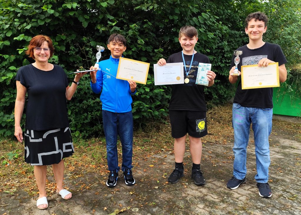 Am 10.07.2024 gab es eine besondere Ehrung unserer drei Gewinner durch die Schulleitung, wo ihnen Frau Welscher gratulierte und stolz zwei Pokale und eine Medaille des Veranstalters sowie Geschenke der Schule überreichte.