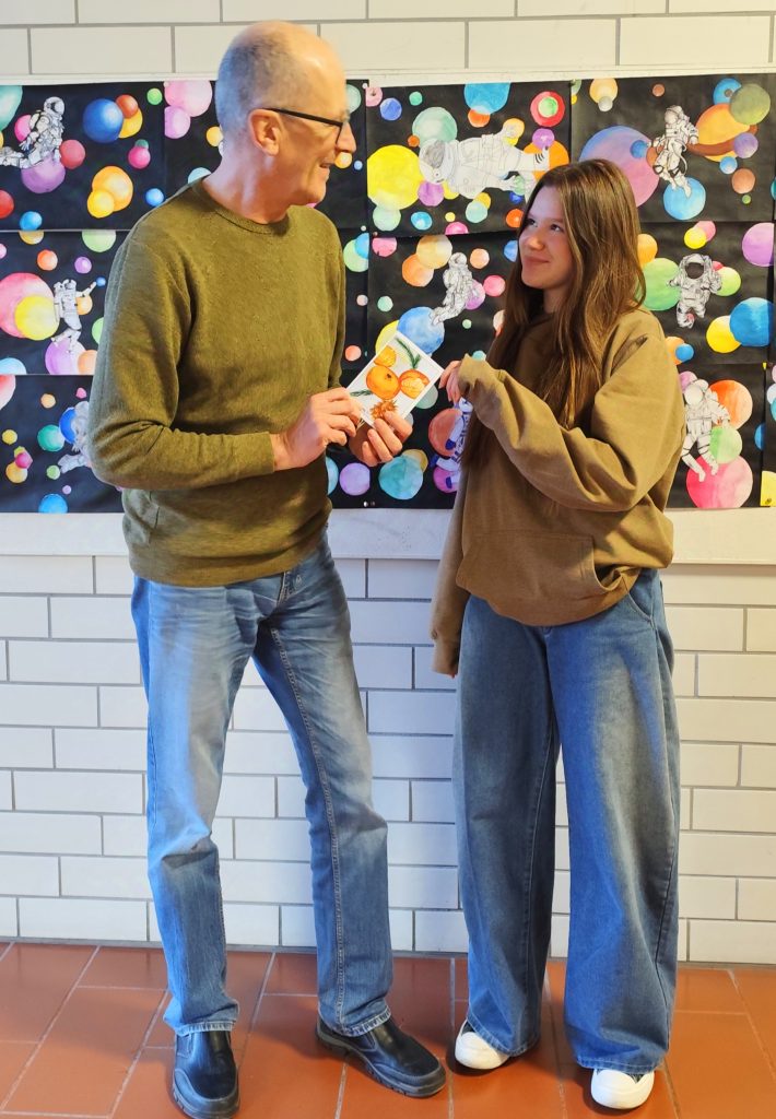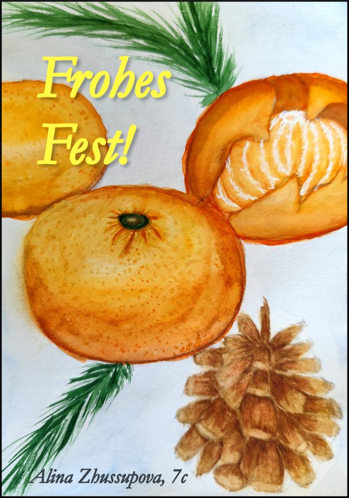 Alina Zhussupova entschied sich für Malerei mit Wasserfarben und lag damit genau richtig. Mit ihrem Bild von den Mandarinen gewann sie den Wettbewerb und erhielt als Preis einige Exemplare ihrer Weihnachtskarte, die vervielfältigt worden war.