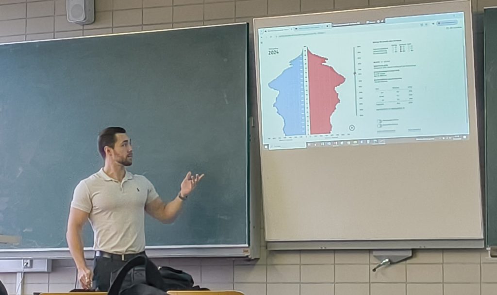 Zu Beginn des Vortrags skizzierte Herr Hochhalter den demografischen Wandel in Deutschland. Er erklärte anschaulich, wie das Verhältnis von Beitragszahlern zu Rentenempfängern sich durch eine alternde Gesellschaft verändert. Mit Beispielen verdeutlichte er, dass immer weniger Erwerbstätige für eine wachsende Zahl an Rentnerinnen und Rentnern aufkommen müssen. Hinzu kommt die steigende Lebenserwartung, die zu einer längeren Bezugsdauer von Renten führt. Die Schülerinnen und Schüler konnten dadurch verstehen, warum das umlagefinanzierte Rentensystem vor immer größere Herausforderungen gestellt wird.