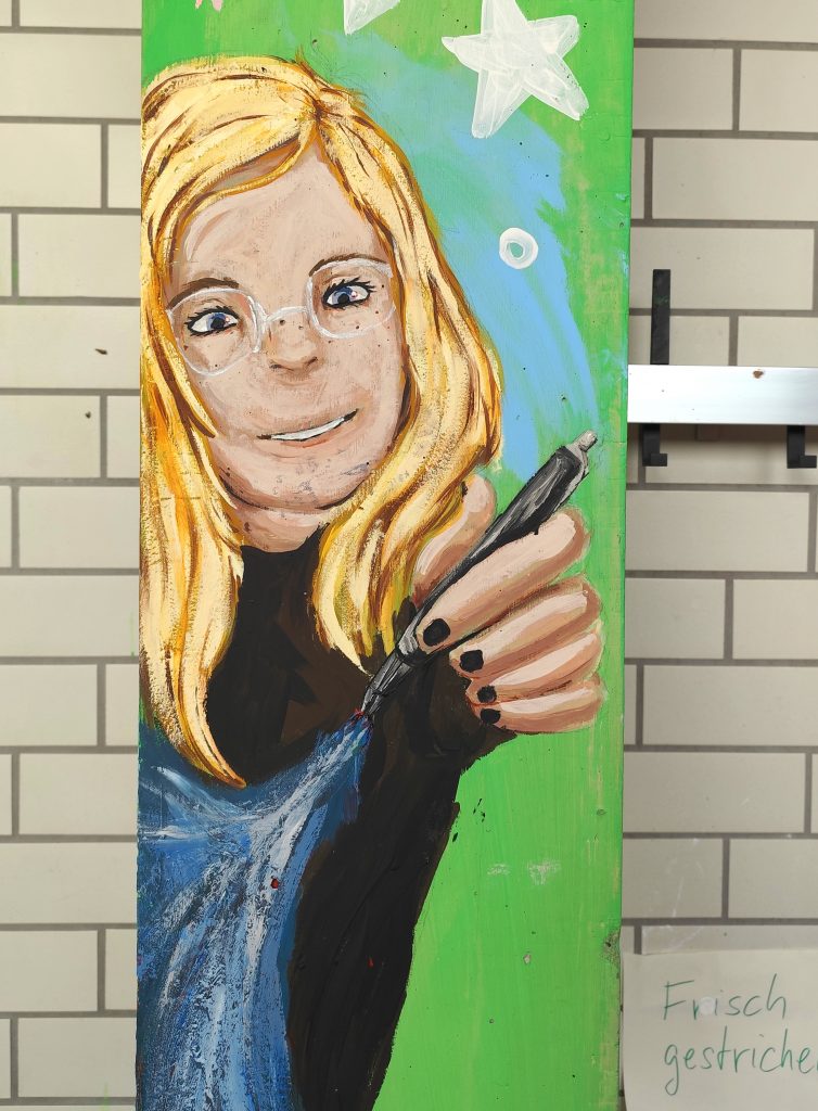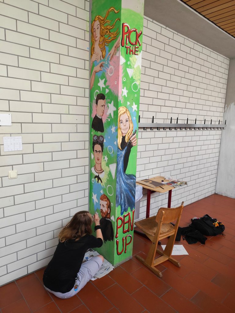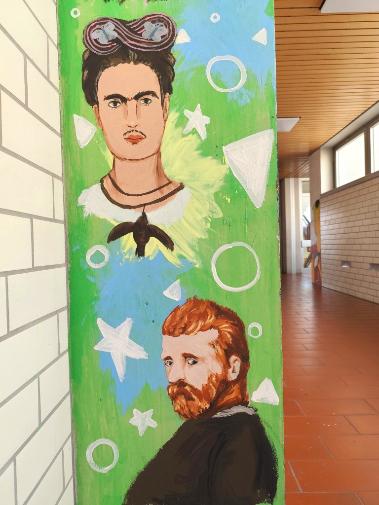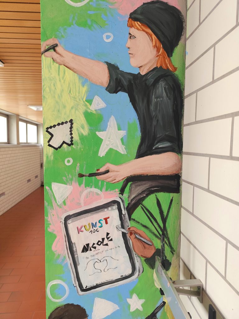 Am Ende des Schuljahrs 2025 durften die scheidenden Schülerinnen und Schüler des Kunstzweigs der zehnten Jahrgangsstufe die grauen Wandpfeiler auf den Gängen der Schule mit Motiven ihrer Wahl bemalen. Die Teilnahme war freiwillig und gab den besonders Interessierten die Möglichkeit, sich nach den anstrengenden Abschlussprüfungen noch einmal künstlerisch auszutoben – richtig großflächig!