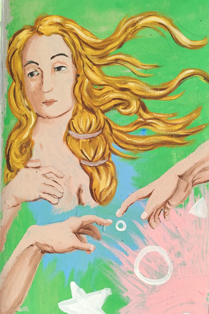 Was ich vor mir sehe, ist eine wunderbare Liebeserklärung an die Welt der bildenden Kunst, insbesondere der Malerei. Ich erkenne Vincent van Gogh und Frida Kahlo. Darüber zitiert Nicole gekonnt zwei Meisterwerke der italienischen Renaissance: Filippo Brunelleschis Geburt der Venus und Michelangelo Buonarrotis Erschaffung Adams. Und noch vieles mehr ziert diesen Pfeiler, der vor dreieinhalb Tagen noch grau war.