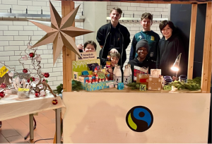 Lichter, Musik und der Duft von Weihnachten: Bei der vorweihnachtlichen Feier der Graf-Stauffenberg-Realschule war auch die Mitmachergruppe mit ihrem Fair-Trade-Verkaufsstand vertreten. Zwischen Punsch und Plätzchen konnten die Besucherinnen und Besucher fair gehandelte Schokolade, Kekse und kleine Geschenkideen entdecken – perfekt für die Adventszeit.