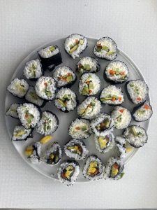 Im Wahlfach „Kochen“ haben die Schülerinnen und Schüler heute mit viel Begeisterung unter Anleitung von Frau Knauf vegetarisches Sushi zubereitet. Gefüllt mit Paprika, Avocado, Mango und Gurke entstanden farbenfrohe und geschmacklich überzeugende Rollen.