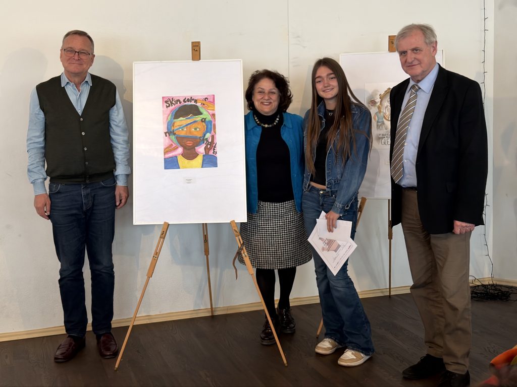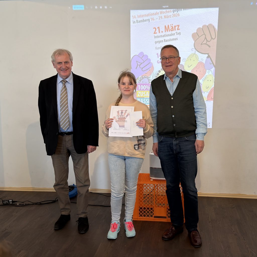 Erfreulich ist, dass erneut beeindruckende Platzierungen beim Wettbewerb erreicht wurden. Yana (8c) belegte beim Filmwettbewerb den 2. Platz und Samira (8c) den 1. Platz beim Plakatwettbewerb. Beide nahmen ihren Preis unter Gratulation von Oberbürgermeister Andreas Starke und vom stellvertretenden Landrat Bruno Kellner persönlich entgegen.