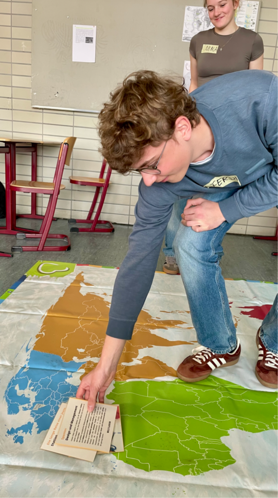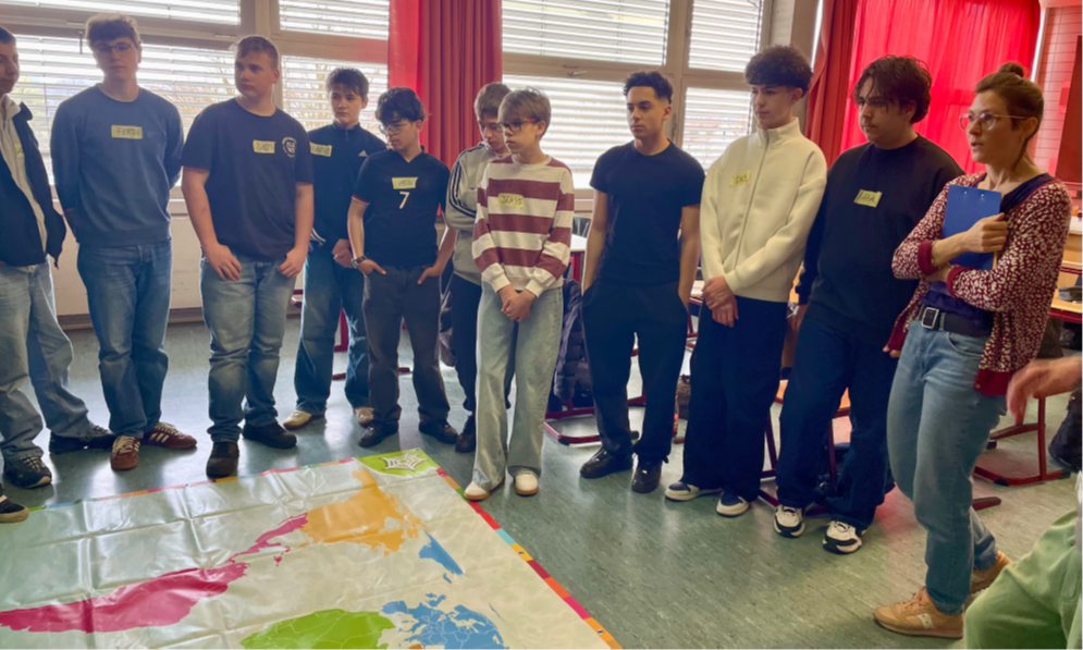 Danach wurde es interaktiv: Mit einer Weltkarte in der Peters-Projektion haben wir gelernt, wie verzerrt unsere Sicht auf die Welt manchmal ist. Beim anschließenden Memoryspiel zur „Reise einer Jeans“ wurde klar, wie viele Länder und Arbeitsschritte hinter einer einzigen Hose stecken – und dass dabei oft nicht alles fair abläuft.