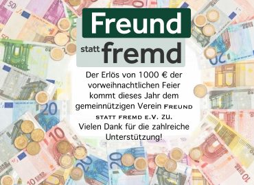 Der Erlös von 1000 € der vorweihnachtlichen Feier kommt dieses Jahr dem gemeinnützigen Verein Freund statt Femd e.V. zu. Vielen Dank für die zahlreiche Unterstützung!