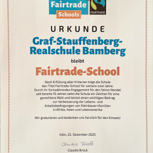 Gute Nachrichten für unsere Schulgemeinschaft: Die Graf-Stauffenberg-Realschule Bamberg darf sich auch in den kommenden zwei Jahren weiterhin Fairtrade-School nennen. Mit der erneuten Verleihung des Titels würdigt die Urkunde das große […]
